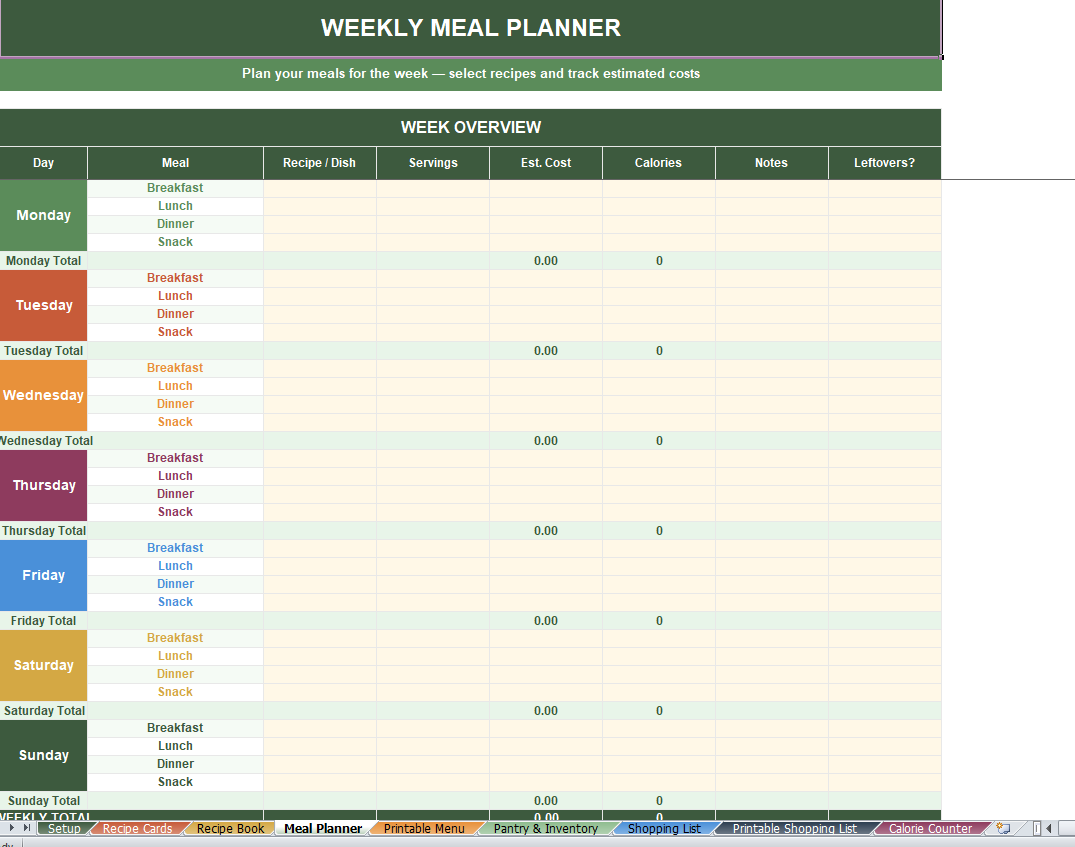 All-In-One Meal Planner spreadsheet