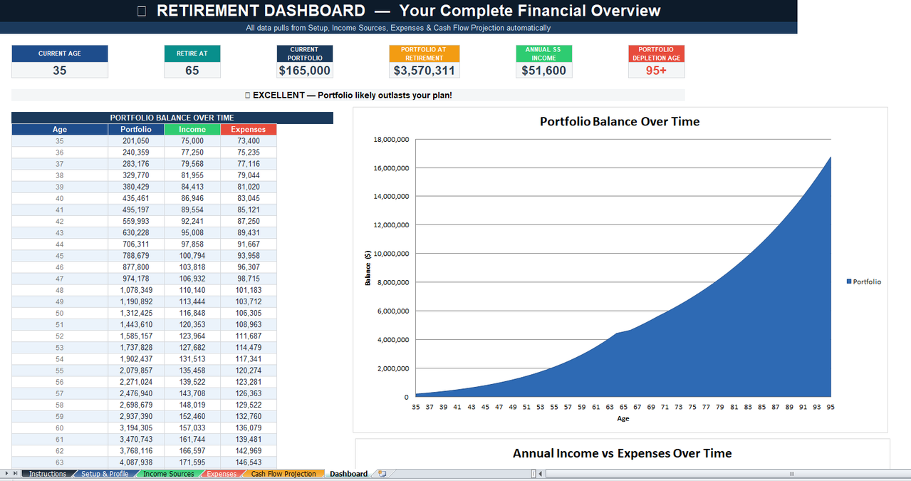 Cash Flow Projection • Income Sources • Expense Planning • Portfolio Tracking • Dashboard. Visual overview with charts: net worth over time, income vs. expenses, portfolio depletion age, and key retirement readiness metrics.